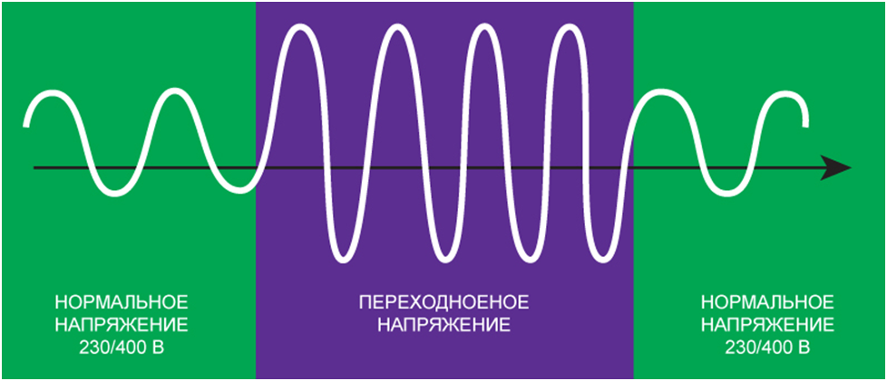 В отличие от атмосферных, коммутационные перенапряжения развиваются не так быстро и могут не иметь столь мощного разрушающего воздействия. Однако нередко они носят повторяющийся характер и тем самым вызывают преждевременное старение оборудования. Переходные перенапряжения промышленной частоты характеризуются тем, что имеют такую же частоту, как и сеть (50, 60 или 400 Гц). Они возникают из-за повреждения изоляции между фазой и корпусом или фазой и землей (в сетях с заземленной нейтралью), а также из-за разрыва нейтрального проводника; при этом однофазные устройства получают напряжение 400 В. Другая причина переходных перенапряжений связана с пробоем проводника, например, при падении кабеля высокого напряжения на низковольтную линию. Третья причина — образование дуги при срабатывании защитного искрового разрядника высокого или среднего напряжения, вызывающее повышение потенциала земли.