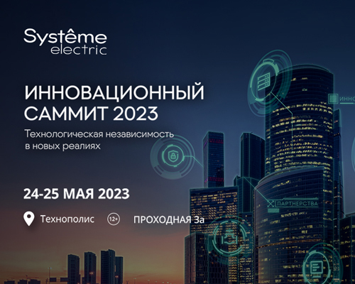От лица компании Systeme Electric (ранее Schneider Electric в России) мы рады пригласить Вас на Инновационный Саммит 2023, который состоится 24-25 мая в Москве в «Технополис Москва».